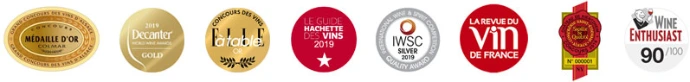 - Crémant Blanc de Noir 2015 : Wine Enthousiast 88/100, Médaille d’Argent au Concours national des crémants, Trophée du vin Effervescent 87/100